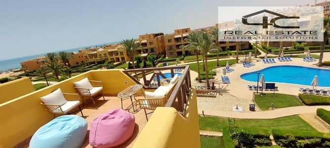 Ground floor chalet for sale in one of Ain Sokhna's most prestigious resorts Mountain View 1 Ain Sokhna It features a direct sea view overlooking the swimming pool.