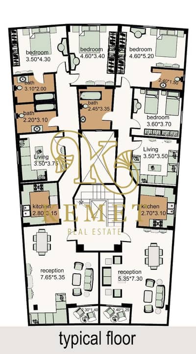 (3 bedrooms + 2 bathrooms + reception + kitchen)