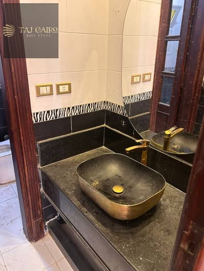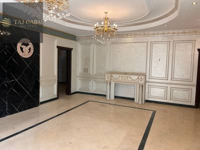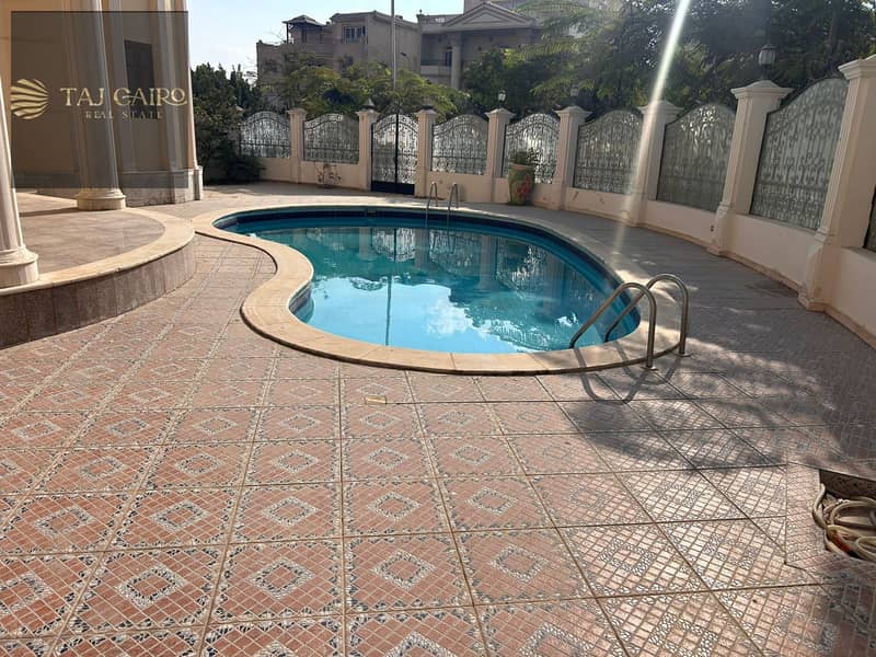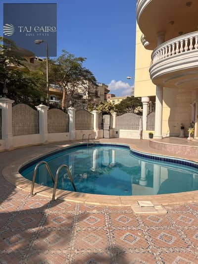 Villa for rent in New Cairo, First District, near 90th Street, Downtown, and Al Shweifat. Basement, ground floor, first and second floors, and roof. Fully air-conditioned with a swimming pool and large garden. High-end finishing.