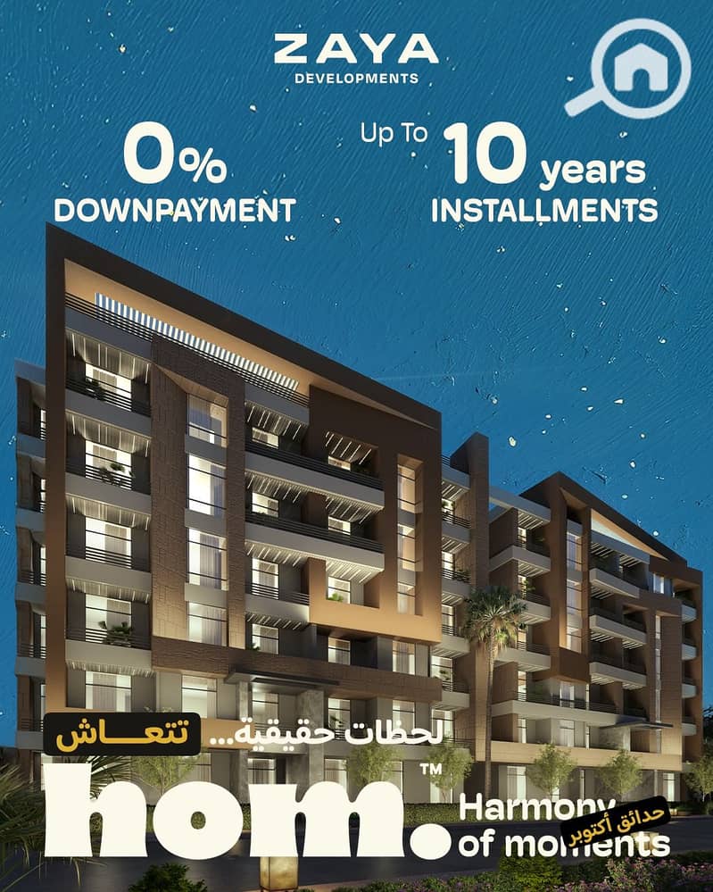 About Home Hadayek October (HOM):Home Hadayek October (HOM) is a distinguished residential project developed by Zaya Developments, located on El Nawaady Street in the heart of the Golden Square. The compound enjoys a strategic location close to major roads such as Fayoum Road and the Ring Road, as well as key landmarks including Zamalek Club and the Grand Egyptian Museum.