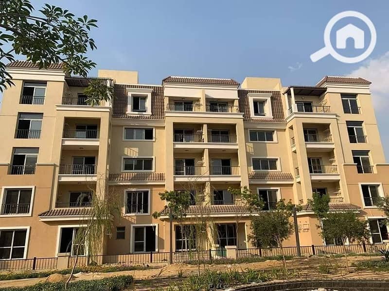 Apartment for sale in Sarai Compound, directly on the Suez Road, walled compound with Madinaty, featuring a distinctive landscaped view