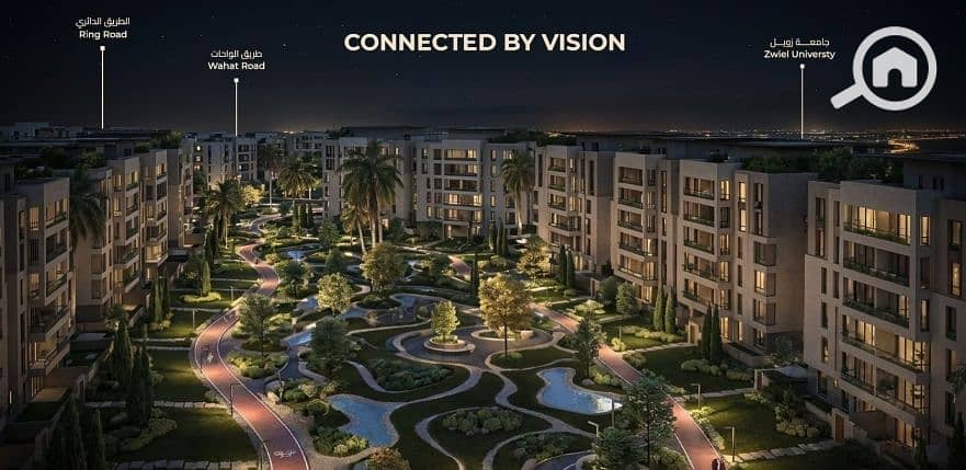 Directly on Zewail Road in front of Zewail University and minutes from Mall of Egypt and the Ring Road.