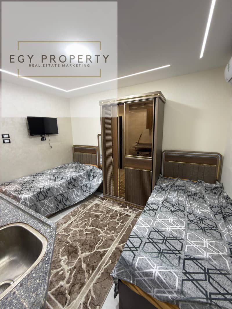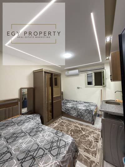 Double studio apartment for rent in 6th of October City, First District, Eighth Neighborhood. First floor with elevator. Suitable for men or women. Furnished and air-conditioned. Internet available. Building has a security guard. Located opposite Nawal El Degwy University and Wadi Degla Club.