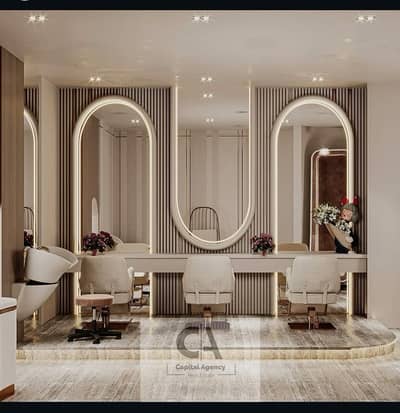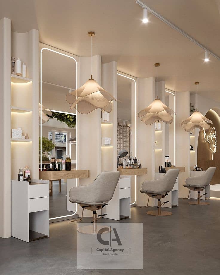 Beauty center for rent, 170 sq m, finished with air conditioning, ground floor, storefront, in a prime mall in New Cairo (Fifth Settlement).