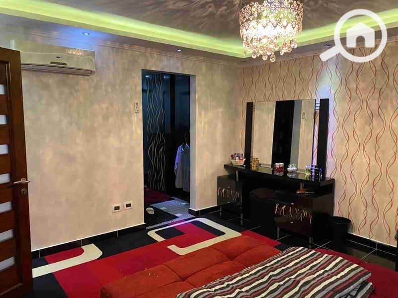 Furnished apartment with water boiler, three bedrooms, reception, extending Jalaal al-Din al-Dasouqi in a new tower, new furniture. Monthly rent required 15,000, one month security deposit, one month commission.