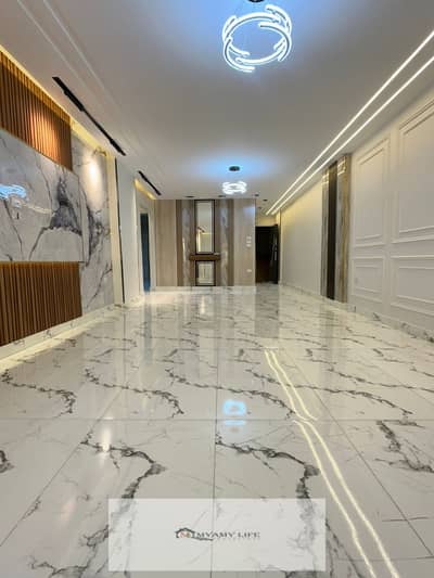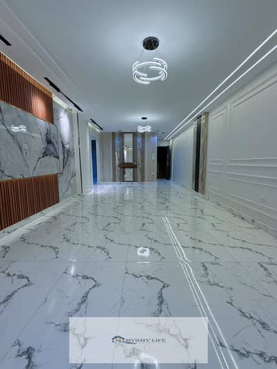 For sale in Al-Ahram Gardens, an apartment with a facade in the middle of the area and near the old second gate, a corner building. There is a camera system covering the building and the garage, monitored from the phone.