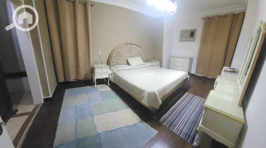 For rent furnished 180m Al-Nasr Street, super luxury façade, 3 bedrooms, 2 bathrooms, reception with three pieces, kitchen with super luxury finishing, distinguished floor, elevator, classy entrance, 24-hour security EM 231