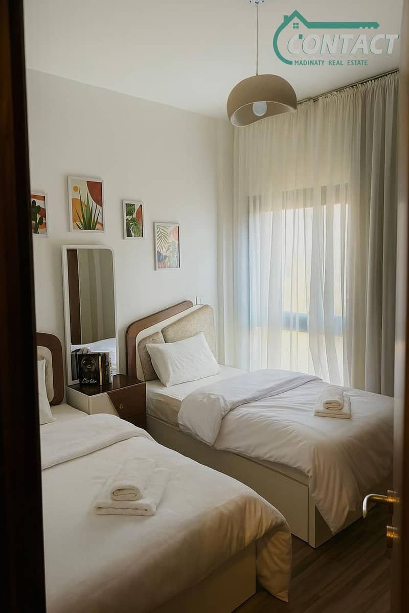 Apartment in Madinaty, Phase Privado, Model (E), 86 sq m, overlooking a garden, includes 2 bedrooms, 1 bathroom, 1 balcony, on the third floor, company finishing, furnished, 45,000 EGP, air-conditioned.