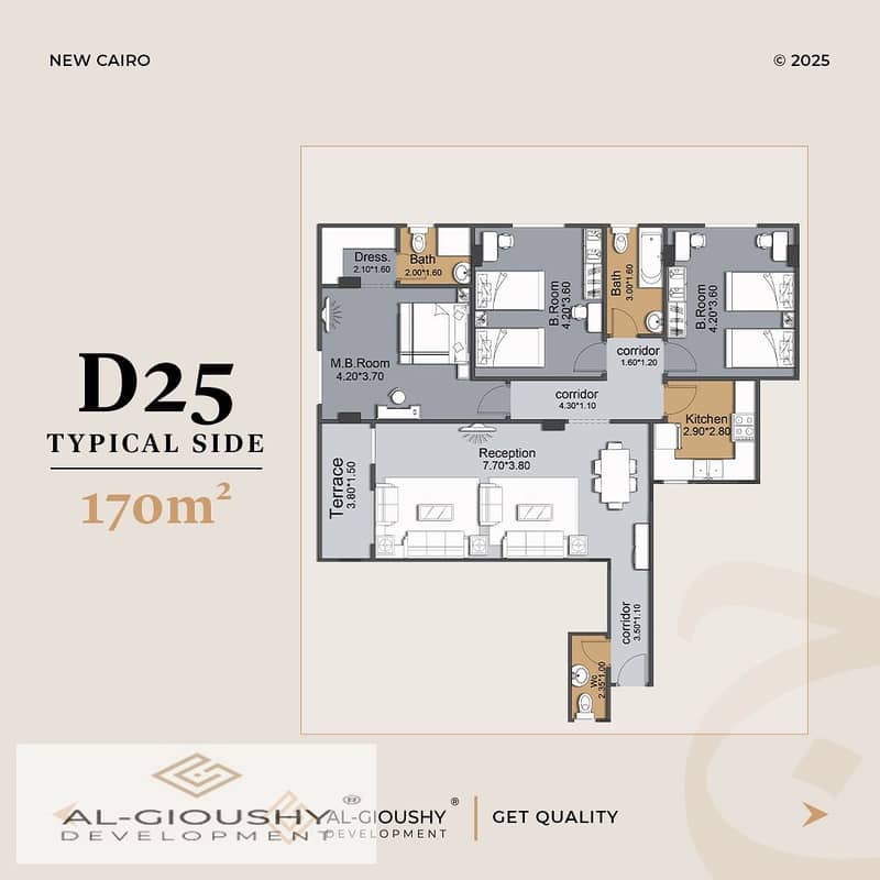 A luxurious apartment with an area of 170 sqm inside plot D25 in Bayt Al-Watan, strategically located on the second row from the clubs street directly.
