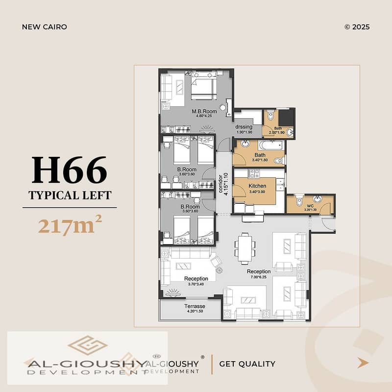 Enjoy living in a 217 sqm apartment within the H66 – بيت الوطن project, with an ideal layout (square design) that ensures the optimal use of every meter inside the unit and a wide panoramic view of the garden.