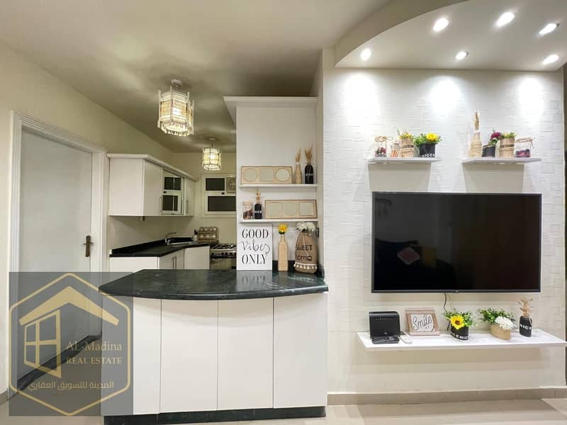 A rare furnished apartment for rent in Madinaty, location B7, 70 square meters, two bedrooms and a bathroom, hotel-style furnishings, brand new condit
