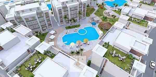 The project offers outstanding facilities including a pyramid hotel, a commercial mall with 17 retail units, 24/7 security, the largest aqua park on the North Coast spanning 3,200 square meters, 16 swimming pools, and a fully equipped health club.
