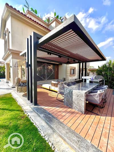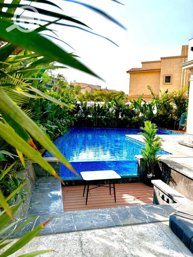 At a high level, it has a swimming pool, central boiler, and central air conditioning. It has part of the facilities with the company for a period of (5) years. The view is open in the front and back, and there is a wide garden. Land area: 660 meters, building area: 424 meters. The villa consists of the following: ground floor with a large reception + kitchen + bathroom + one room; first floor with 4 rooms + 2 bathrooms; the roof has two rooms.