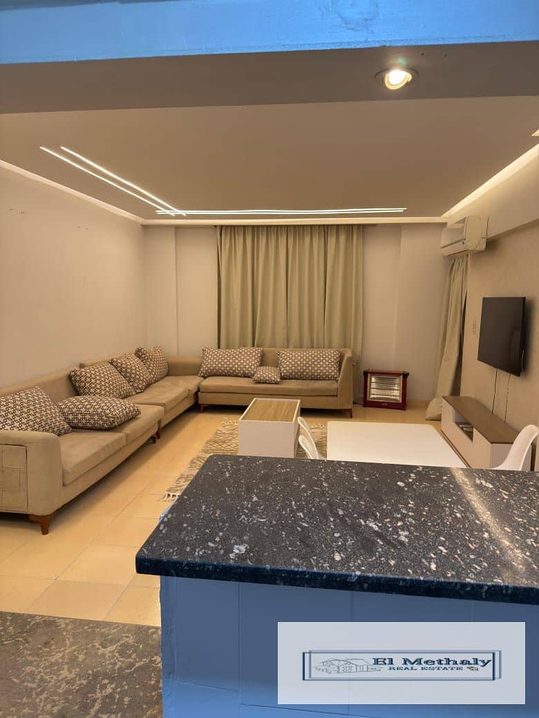A distinctive furnished apartment for rent in Al Rehab City, New Cairo, next to the Eastern Market and services.