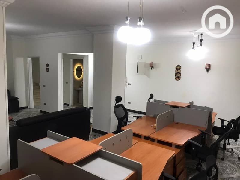 Fully furnished and air-conditioned office for rent in a strategic location branching off from the main Abbas Al-Akkad Street, one of the most prestigious streets in Nasr City. 3 spacious rooms and a reception area with 3 pieces, 2 bathrooms, and 3 balconies with an open view of the heart of Nasr City. The layout is practical for companies, administrative offices, clinics, and all fields. Super Lux finishes, luxurious front facade, equipped, and includes gas, 4 computers, and 5 air conditioners for a rental price of 60,000 EGP.