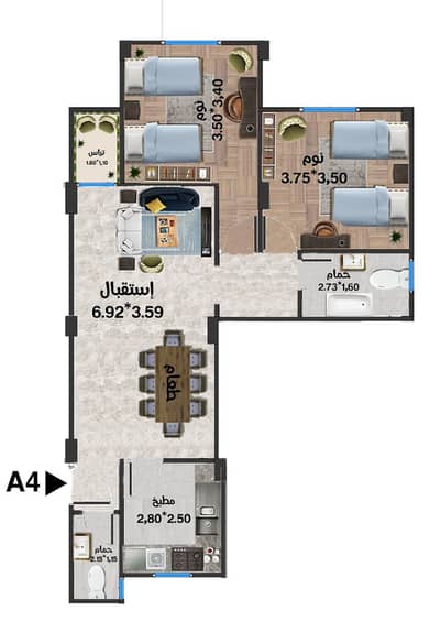 Apartment specifications: (3 bedrooms / 2 bathrooms / reception area / front terrace)
