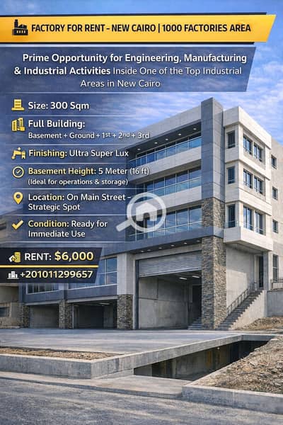 Factory for Rent – Fifth Settlement | The Thousand Factories area offers a prime opportunity for various industrial activities within one of the strongest industrial zones in New Cairo. Area: 300 sq m Complete Building: Basement + Ground + First + Second + Third Floors Finishing: Ultra Super Lux Basement Height: 5 m (Suitable for operation and storage) Location: On a main street – Strategic location Condition: Ready for immediate operation Rent: $6,000 For details and viewing: Deal By Deal