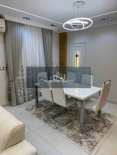 Furnished apartment for rent in Madinaty, 131 sq m, in Block B1. First occupancy, modern furnishings, high-end finishes, fully air-conditioned, wide garden view, steps from Madinaty Club and Open Air Mall, near amenities.
