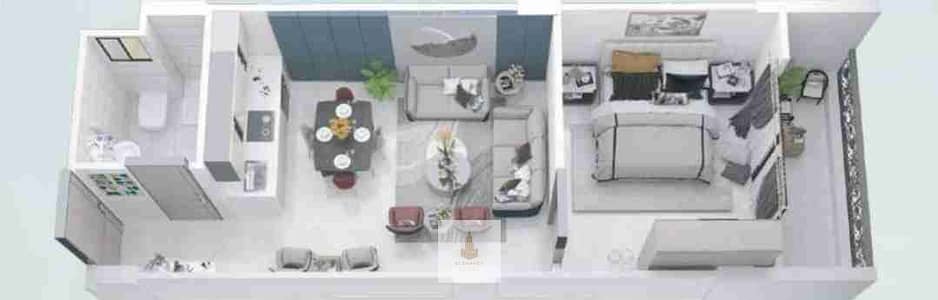 Spanning 50 m², the unit is thoughtfully designed for optimal space use, featuring a comfortable bedroom, a spacious reception area, a functional kitchen, a modern bathroom, and a terrace offering an open view that brings in natural light and a sense of openness.