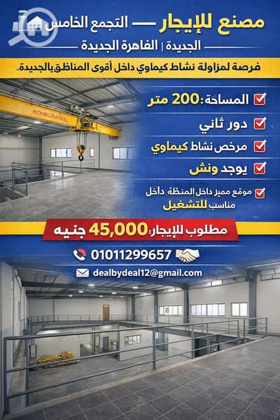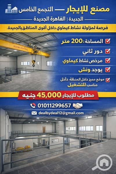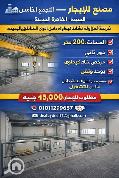 Factory for rent in Fifth Settlement Industrial Area, 200 square meters, second floor, chemical activity