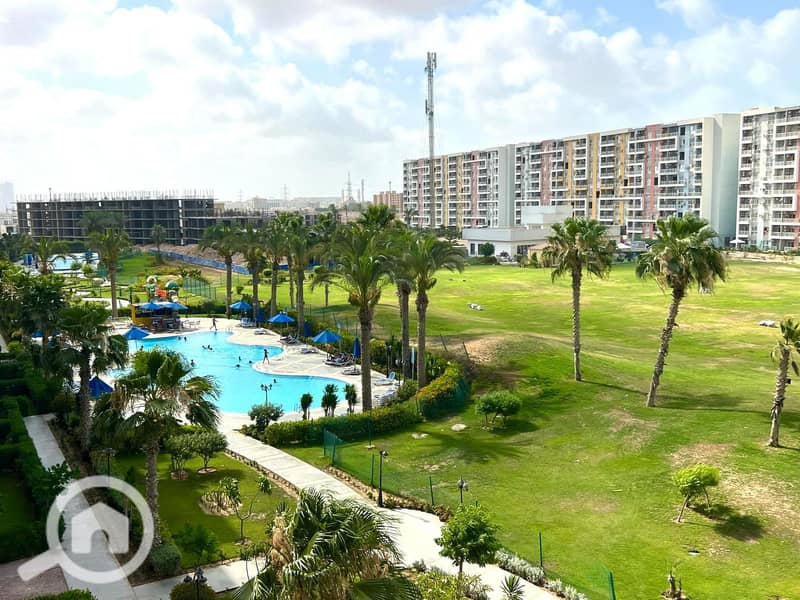 Overlooking the landscape and swimming pools. 47 sq m. 1 bedroom, 1 bathroom, 1 American-style kitchen, 1 reception area, 1 large balcony with a breathtaking view. Fully furnished with brand new furniture and air conditioning. All electrical appliances included. 1,700,000 EGP cash.
