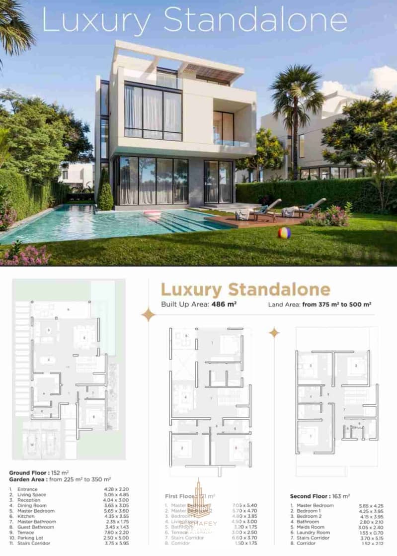 Standalone villa on ground + 2 floors with 486m² built-up area and garden from 225m² to 350m², 7 bedrooms, 8 bathrooms, 300m frontage.
