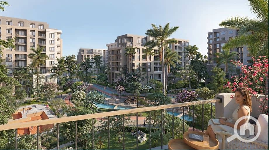 For sale: 122 sqm apartment in Lush Valley Compound, New Cairo, in the Lotus District, next to AUC, with a 5% down payment and installments over 8 years.
