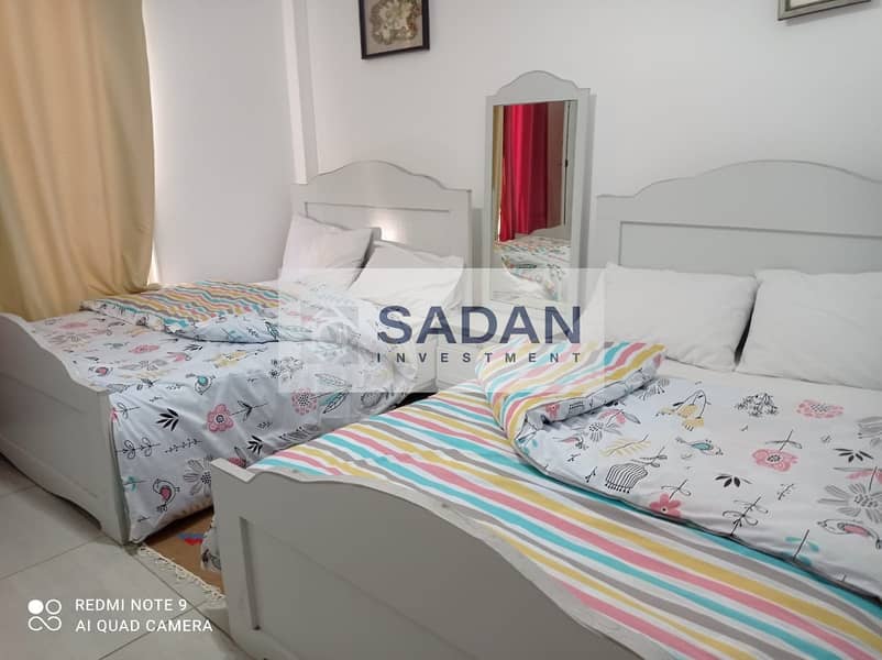 Lowest price ground floor chalet with a garden in a prime location in Amwaj Village, North Coast. Fully furnished and equipped with air conditioning.