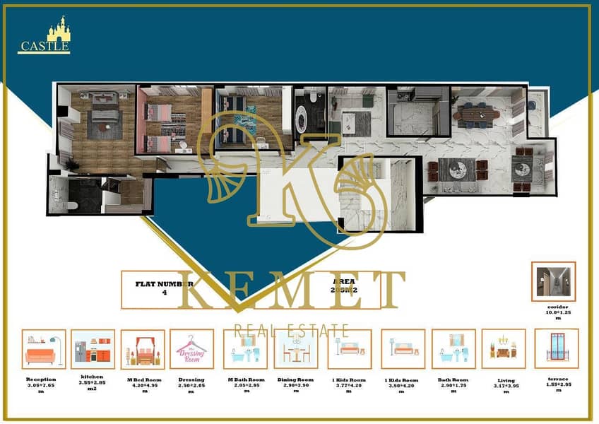 Apartment for sale in **New Lotus**, 205 sqm, 2nd floor, 3 bedrooms (1 master), 2 bathrooms, reception, living can be 4th room, semi-finished, immedia