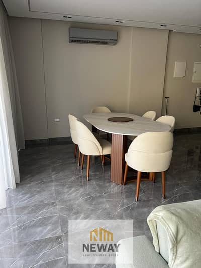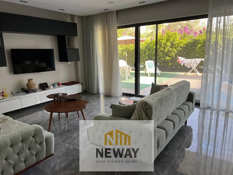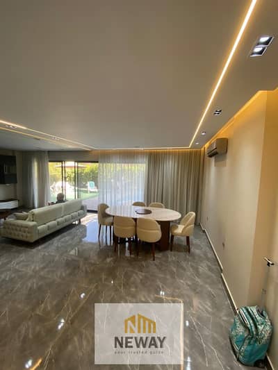 Ground floor apartment for rent in Lake View Residence with a spacious area of 200 sqm and a private garden of the same size, offering a stunning lake view and direct access to the pool within the compound. The apartment is fully furnished with a modern, contemporary design, and an Arabic seating area can be added upon request for extra comfort.