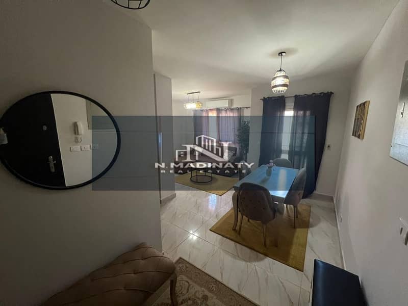 Furnished studio apartment for rent in Madinaty, 64 sq m, in B12. First occupancy, high-end finishing, modern furnishings, fully air-conditioned, with
