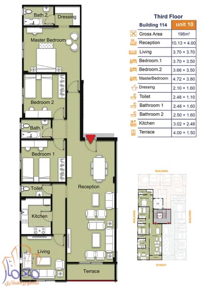3 bedrooms, 3 bathrooms, receptiom, kitchen, terrace