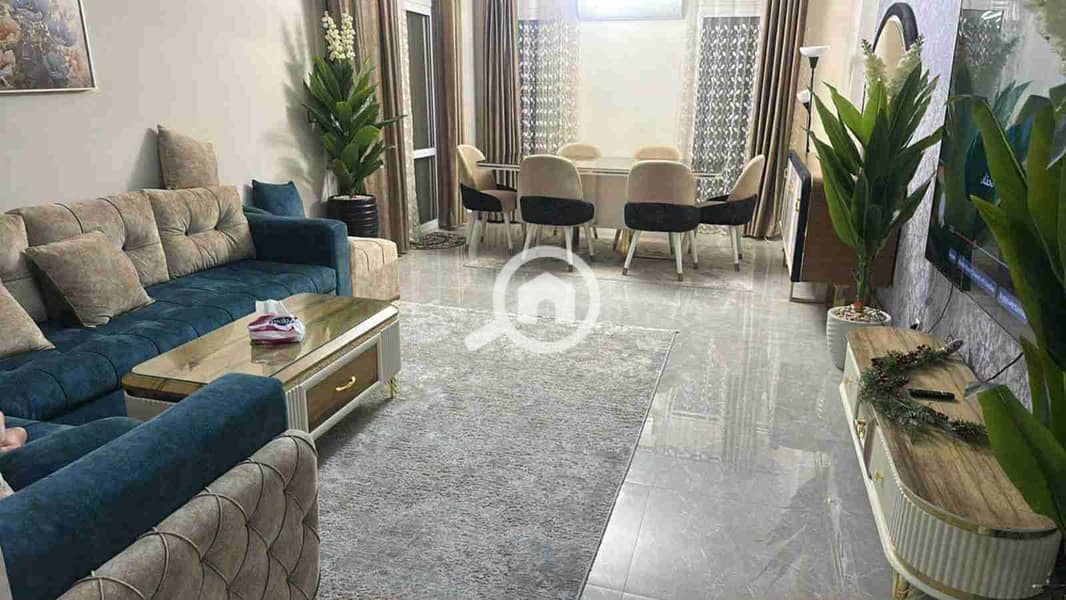 Apartment for sale in Madinaty, ground floor, 128 sqm with a private garden of 45 sqm, distinguished area B3, 3 bedrooms and 2 bathrooms, fully furnished with electrical appliances, super Lux finishing, elegant and very distinctive furnishings.