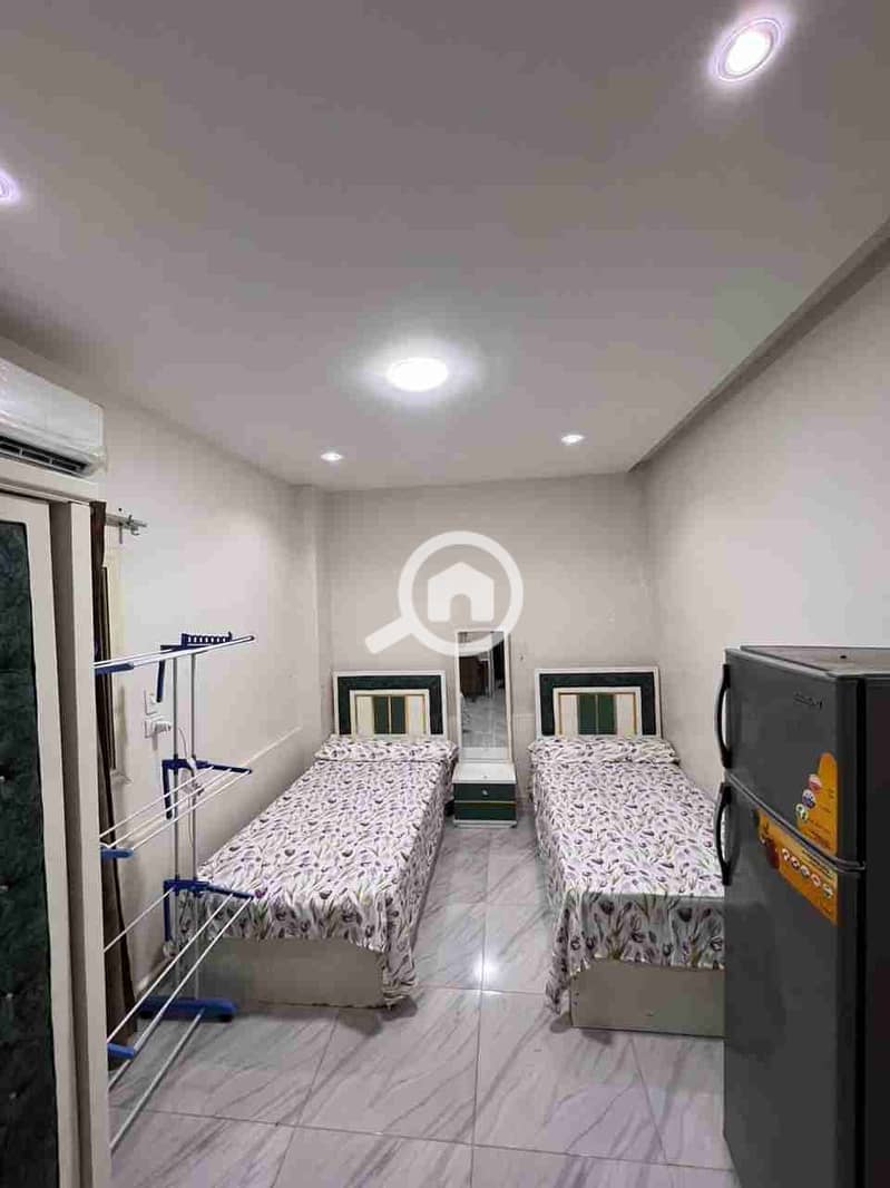 Double Studio for rent in 6th of October City, First District, Sixth Neighborhood for rent including electricity and water, air conditioning. We also have more than one furnished studio for rent in 6th of October in the best neighborhoods. The studio consists of a refrigerator, washing machine, air conditioner, water heater, stove, a screen, 2 beds, and all services are available. There is 24-hour security and cameras on the premises. The studio is close to all services. To contact us: