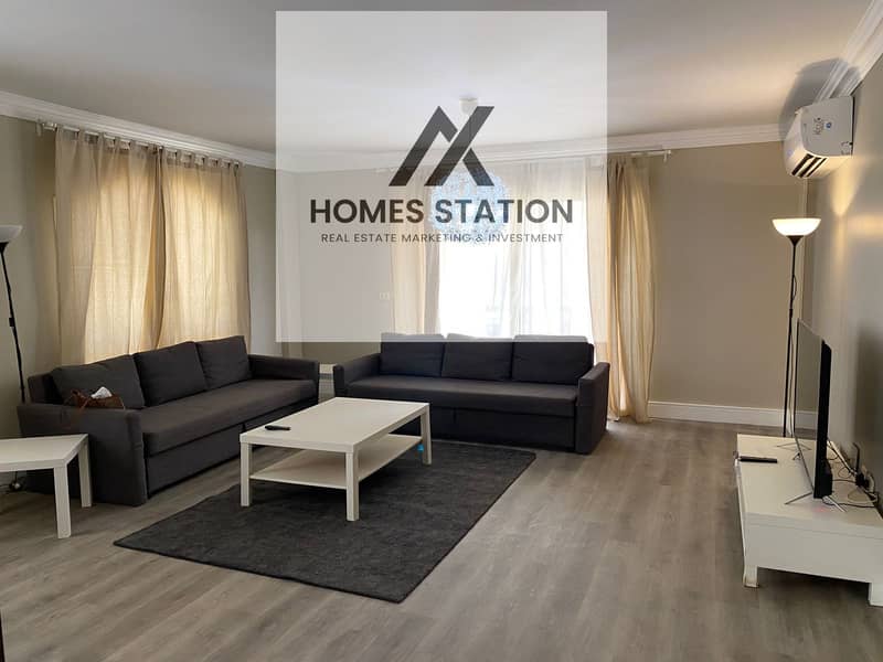 A fully furnished apartment for rent in Marvile Compound, New Cairo, located in front of the American University. Spacious, high-end design with fully equipped kitchen and appliances, ideal for upscale family living.