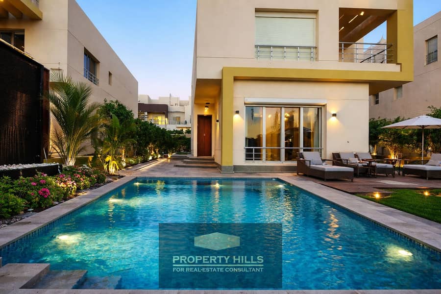 Fully finished, ultra-super-luxurious panoramic twin villa, 430 sq m, 3 floors with a private swimming pool, next to Mountain View and Nyoum October.