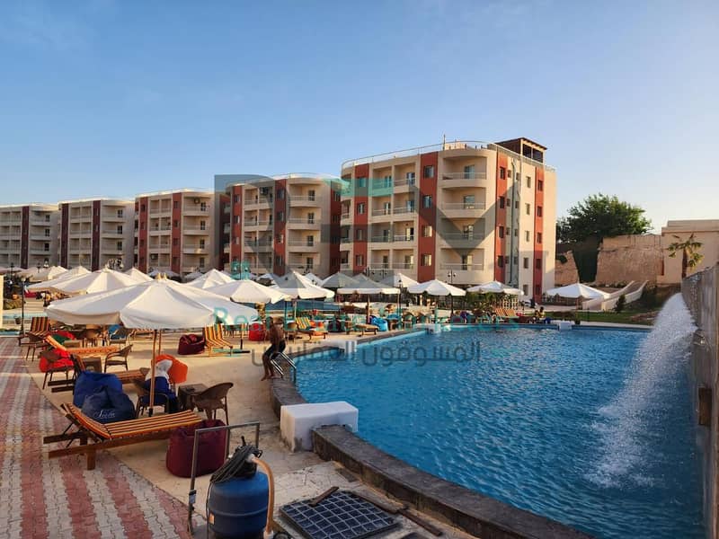 A ready-to-move chalet with an area of 50 sqm, Super Lux finishing, located on the first floor with a direct view of the swimming pool and waterfall.